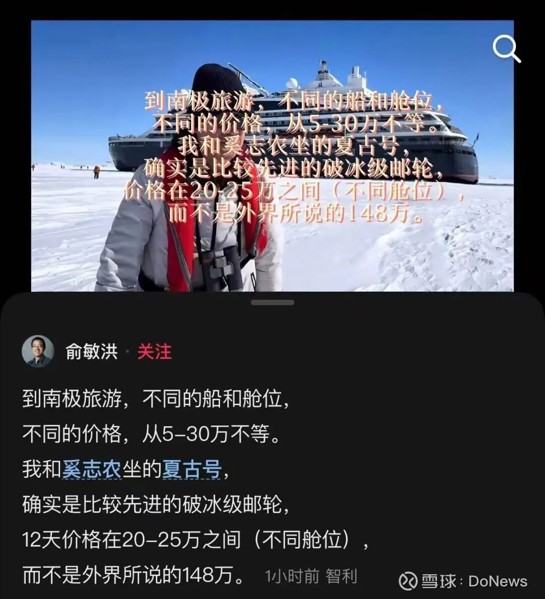 DoNews11月20日消息,据红星新闻报道,11月20日,新东方董事长俞敏洪在社交平台发文,辟谣“到南极坐邮轮花148万”:到南极旅游,不同的船和舱位,不同的价格,从5-30万不等,自己和奚志农坐的夏古号,确实是比较先进的破冰级邮轮,12天价格在20-25万之间,而不是外界所说的148万。