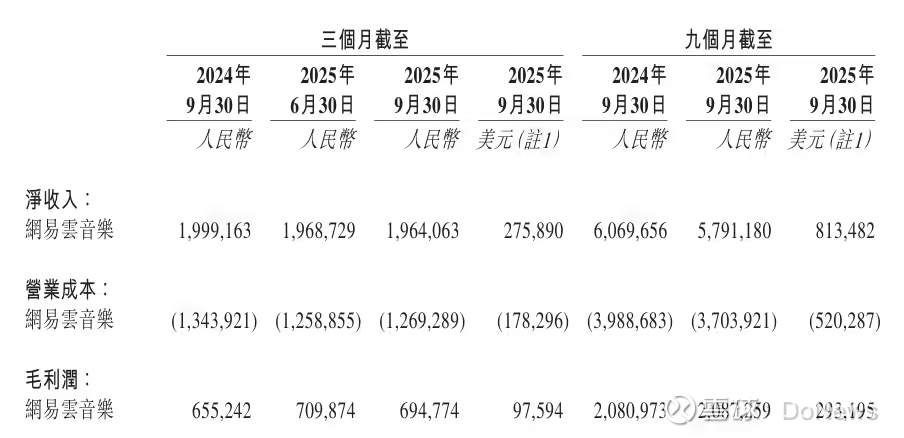 DoNews11月20日消息,网易云音乐今日在港交所发布了截至 2025 年 9 月 30 日止第三季度未经审计财务业绩:净收入为人民币 19.64 亿元(2.759 亿美元),同比减少 1.8%。毛利润为人民币 6.95 亿元(9759.4 万美元),同比增长 8.3%。
