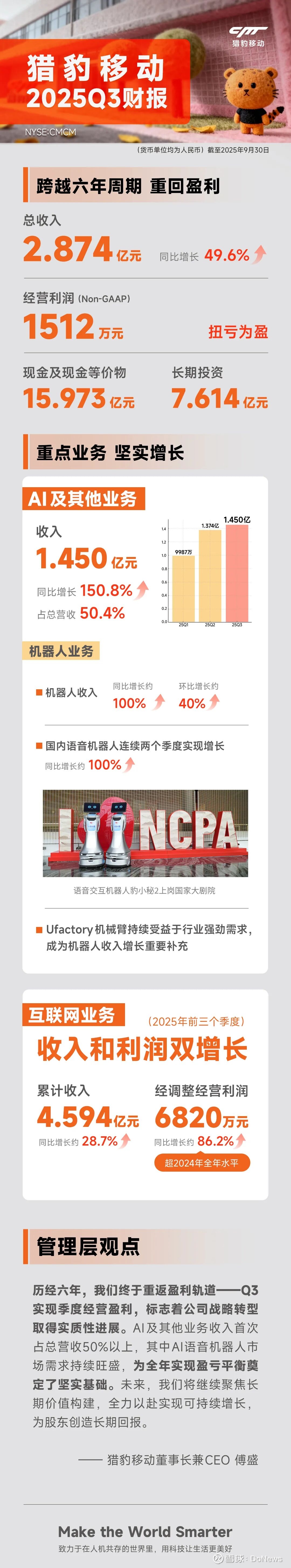 猎豹移动董事长兼首席执行官傅盛表示,“历经六年,我们终于重返盈利轨道,标志着公司战略转型取得实质性进展。AI及其他业务收入占总营收的50%以上,其中AI语音机器人市场需求持续旺盛,为全年实现盈亏平衡奠定了坚实基础。”
