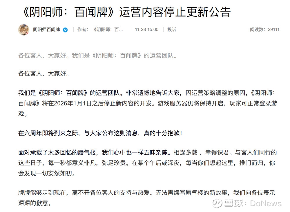 DoNews11月28日消息,网易《阴阳师:百闻牌》官微今天下午通过官微宣布,因运营策略调整,《阴阳师:百闻牌》将在 2026 年 1 月 1 日之后停止新内容的开发。游戏服务器仍将保持开启,玩家可正常登录游戏。