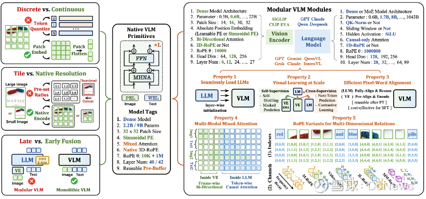 此次,商汤彻底摒弃了传统的模块化结构,从底层原理出发,推出了从零设计的 NEO 原生架构。NEO 架构通过在注意力机制、位置编码和语义映射三个关键维度的底层创新,让模型具备了统一处理视觉与语言的能力。