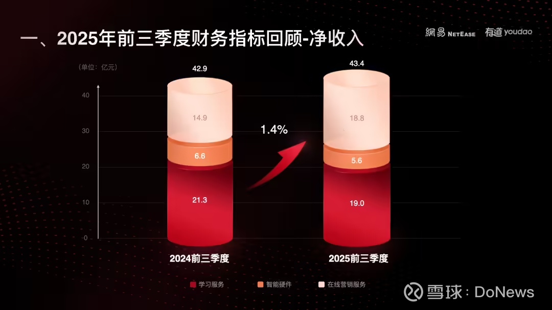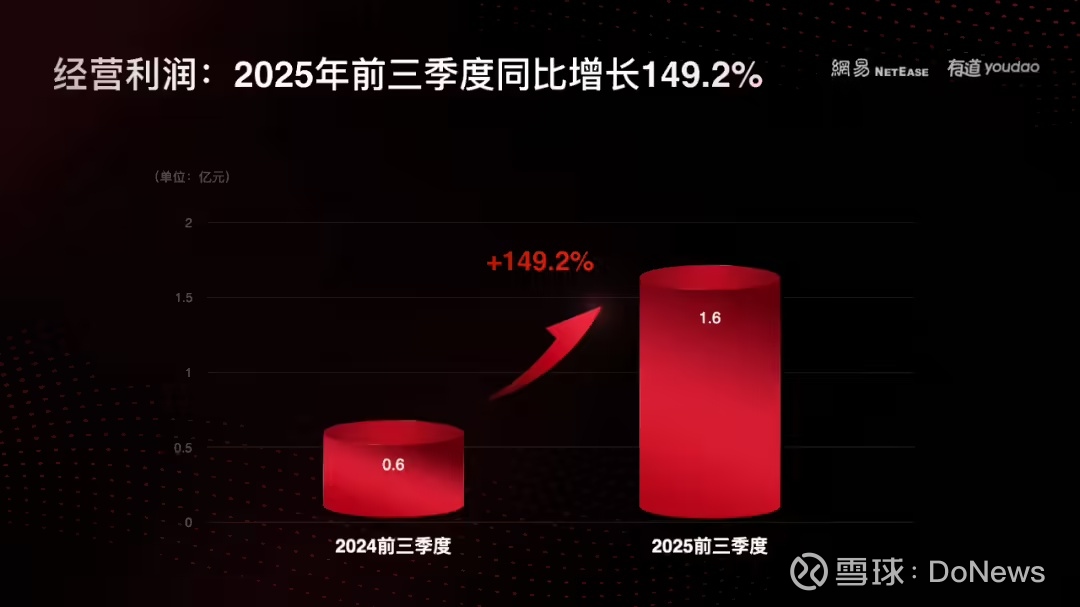 网易有道 CEO 周枫表示,今年前三季度,有道累计净收入 43.4 亿元,同比增长 1.4%。在业务增长的基础上,包括销售费用、管理费用在内的运营费用同比下降,带动了经营利润提升至 1.6 亿元,同比增长 149.2%。