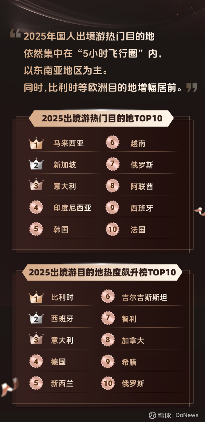 凭借地理位置毗邻、旅游资源丰富、性价比高等优势,东南亚、东北亚周边国家“五小时飞行圈”和“免签朋友圈”依然是国人2025年度出境游的首选。在出境游前十大热门目的地中,马来西亚、新加坡、印度尼西亚等对中国游客免签的东南亚目的地均上榜,意大利、韩国、俄罗斯等也排名靠前。在出境游目的地飙升榜前十名中,比利时、西班牙等欧洲目的地表现亮眼。