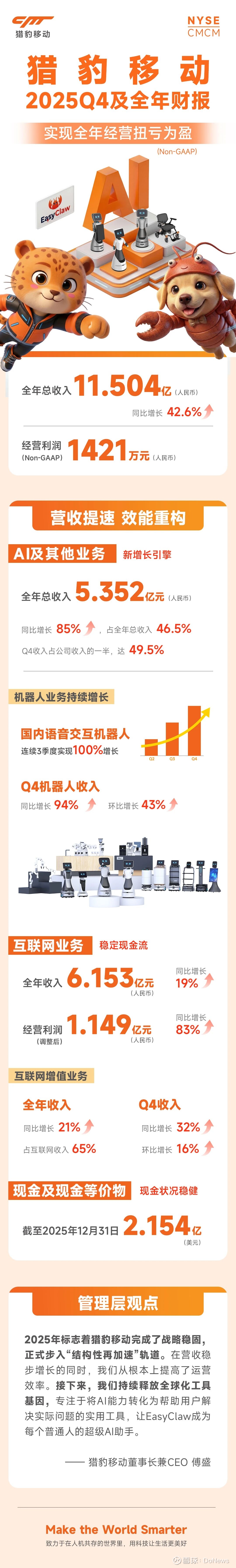 DoNews3月24日消息,3月24日,猎豹移动发布2025年第四季度及全年财报。2025全年总收入达11.504亿元,同比增长42.6%,Non-GAAP营业利润为1421万元。公司经营扭亏为盈,标志着公司实现收入增长的同时,经营效率得到根本性改善。