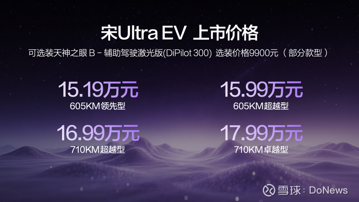 3月26日,比亚迪宋Ultra EV 正式上市,共4款车型,包括605KM领先型、605KM超越型、710KM超越型和710KM卓越型,官方指导价15.19万-17.99万元。新车全系搭载比亚迪第二代刀片电池及闪充技术,同时拥有710公里CLTC纯电续航、天神之眼B、云辇-C、TBC高速爆胎稳行系统等豪华配置,为消费者带来全新的纯电出行方式,全面开启闪充时代。