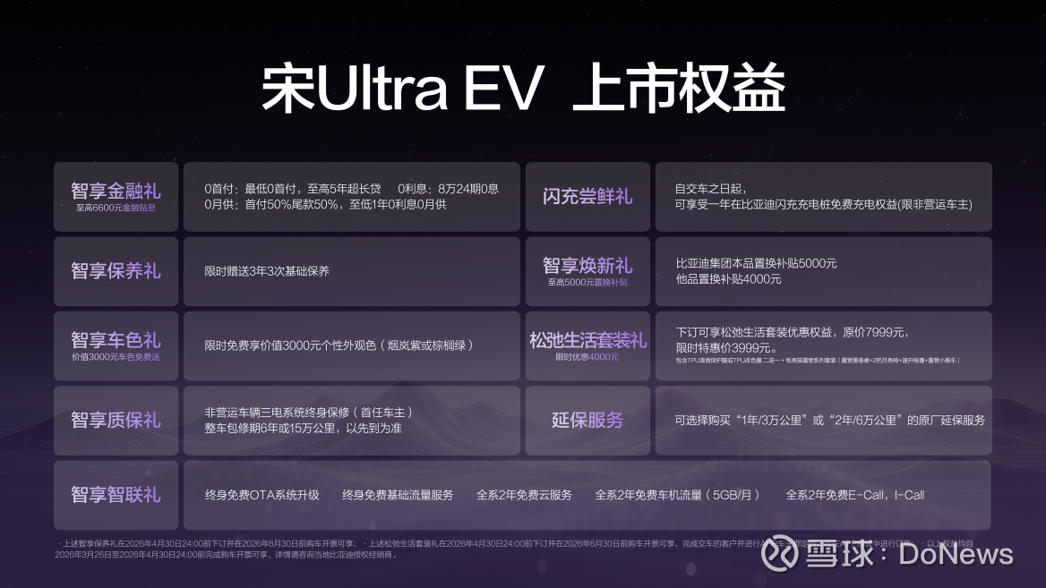 比亚迪王朝正在构建一个从购车、用车、到养车的全链路无忧体系。为此,宋Ultra EV带来了”0元购、0元用、0元养”的超重磅购车权益!同时还有其他丰富权益,为用户带来超值购车体验。