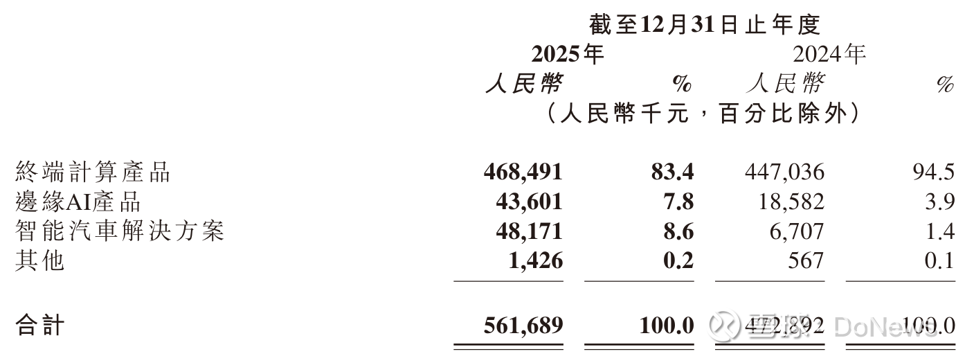 爱芯元智营收主要分为终端计算产品、边缘AI产品、智能汽车解决方案三部分收入构成,其中,爱芯元智2025年来自终端计算产品收入为4.69亿元,较上年同期的4.47亿元增长4.8%。