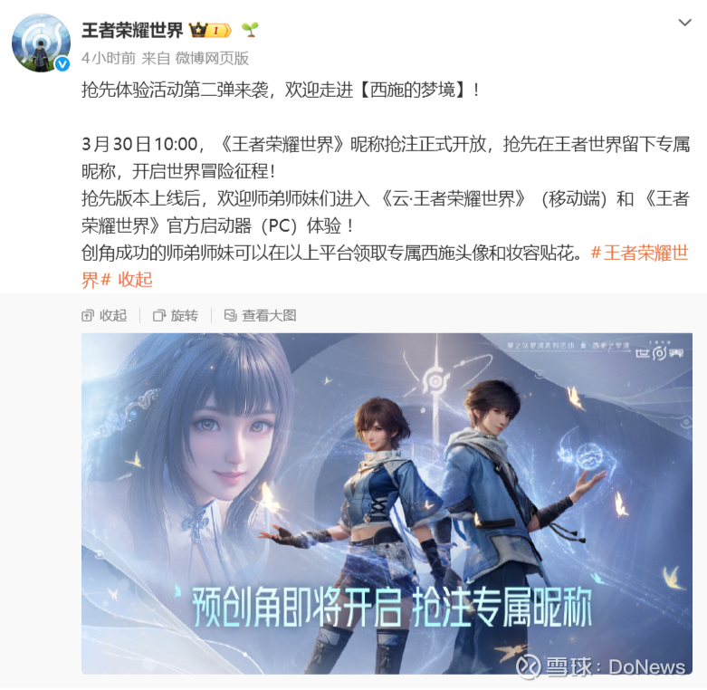 DoNews3月29日消息,3月29日,腾讯《王者荣耀世界》官方宣布,3月30日10:00将正式开放昵称抢注。另外,抢先版本上线后,玩家可在《云 · 王者荣耀世界》(移动端)和 《王者荣耀世界》官方启动器(PC)体验。