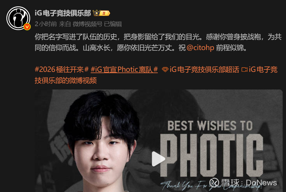 DoNews3月29日消息,3月29日晚,iG电子竞技俱乐部官方账号发布人员变动公告:确认Photic离队。iG表示:你把名字写进了队伍的历史,把身影留给了我们的目光。感谢你曾身披战袍,为共同的信仰而战。山高水长,愿你依旧光芒万丈。祝@citohp 前程似锦。