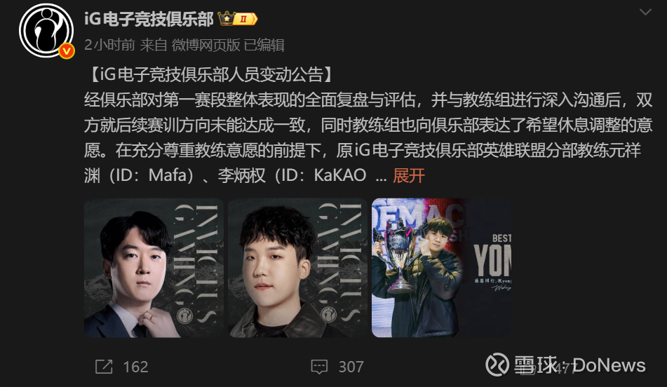 在充分尊重教练意愿的前提下,原iG电子竞技俱乐部英雄联盟分部教练元祥渊(ID:Mafa)、李炳权(ID:KaKAO)、权勇秀(ID:yongsoo)即日起正式卸任教练职务。