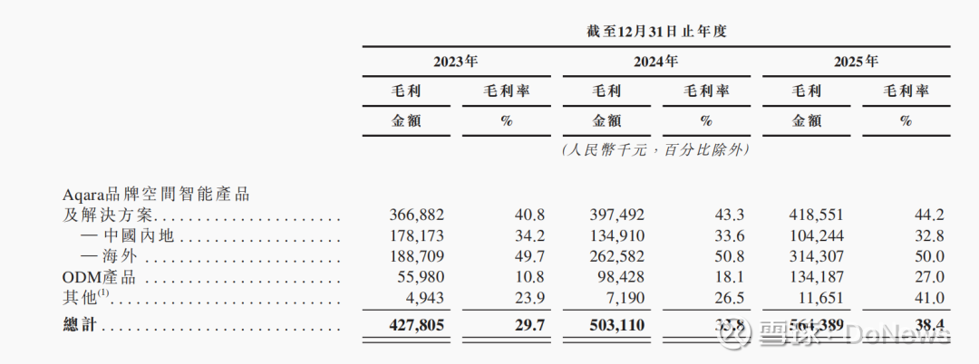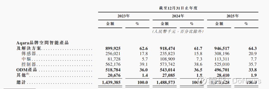 2023年至2025年ODM业务收入分别为5.19亿元、5.43亿元和4.97亿元,占总收入的33%至37%,是总收入中体量第二的板块,仅次于绿米联创品牌空间智能产品及解决方案。