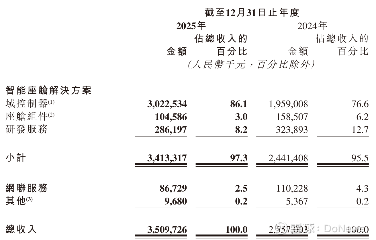 博泰车联2025年来自智能座舱解决方案的收入为34.13亿元,占营收的比例为97.3%;其中,来自域控制器收入为30.22亿元,占营收的比例为86.1%;来自座舱组件收入为1.05亿元,占比为3%;来自研发服务的收入为2.86亿元,占比为8.2%。