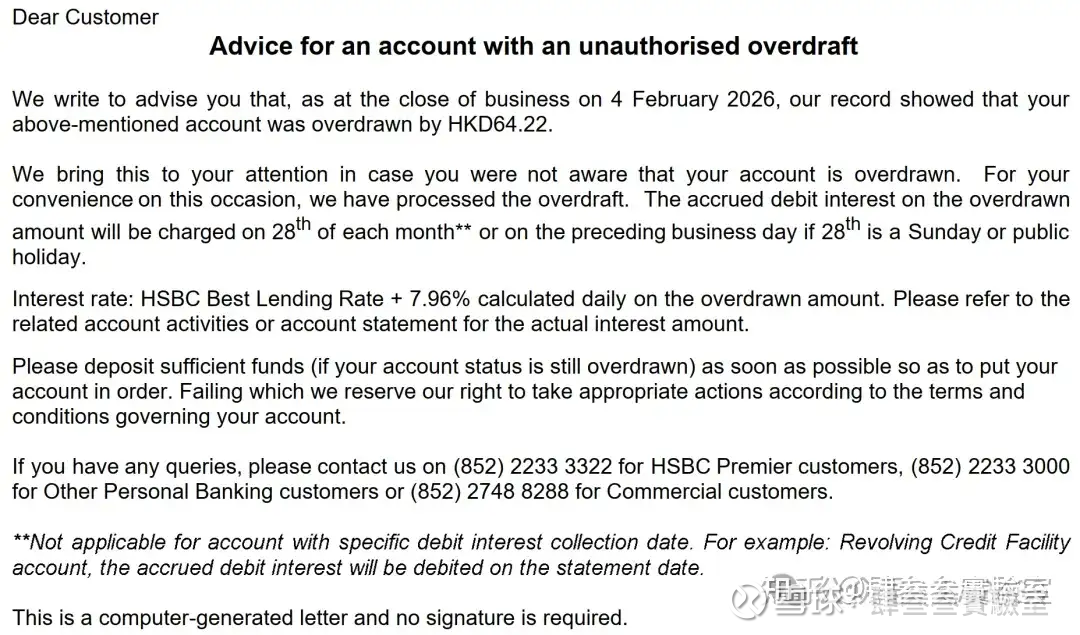 登录汇丰APP一看,账户余额成负的了。