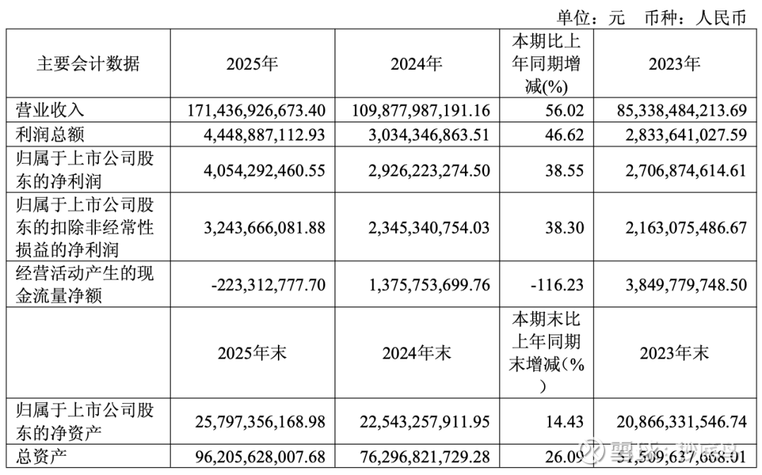 据其发布的2025年度业绩报告显示,公司实现营业收入1714.36亿元,同比增长56.02%;实现归属于上市公司股东的净利润为40.05亿元,同比增长38.55%。