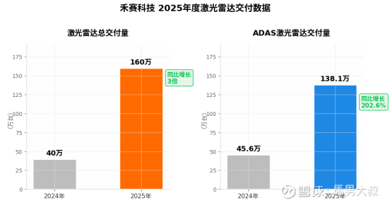 2025全年激光雷达总交付量160万台,同比增长至3倍。其中ADAS激光雷达交付1,381,133台,同比增长202.6%。