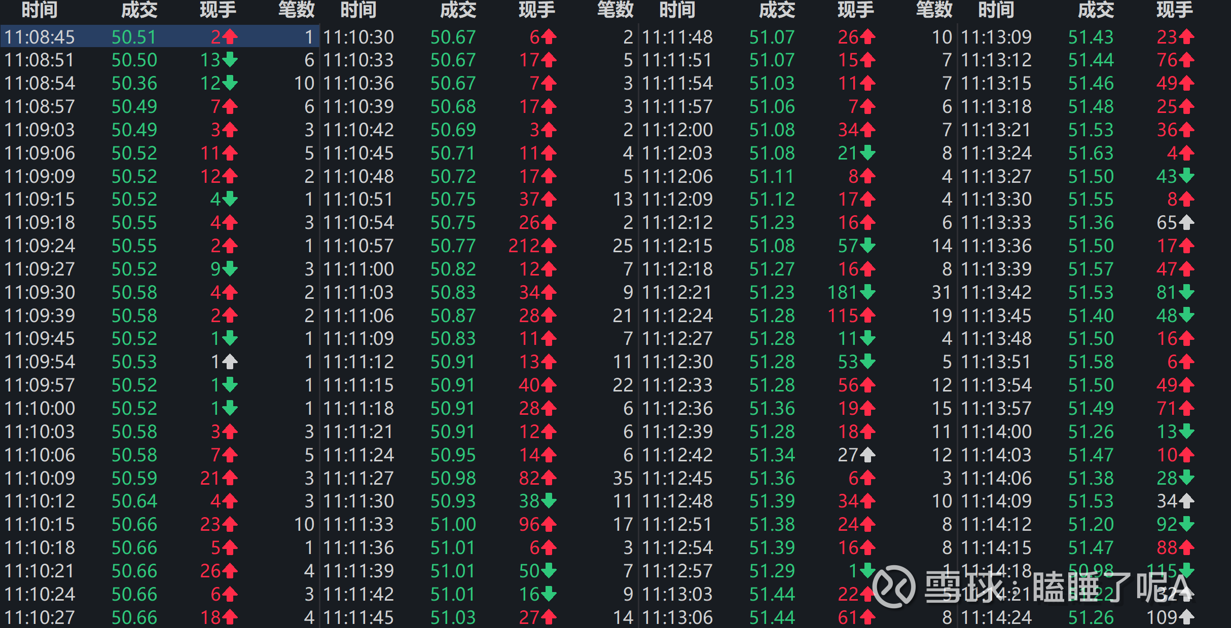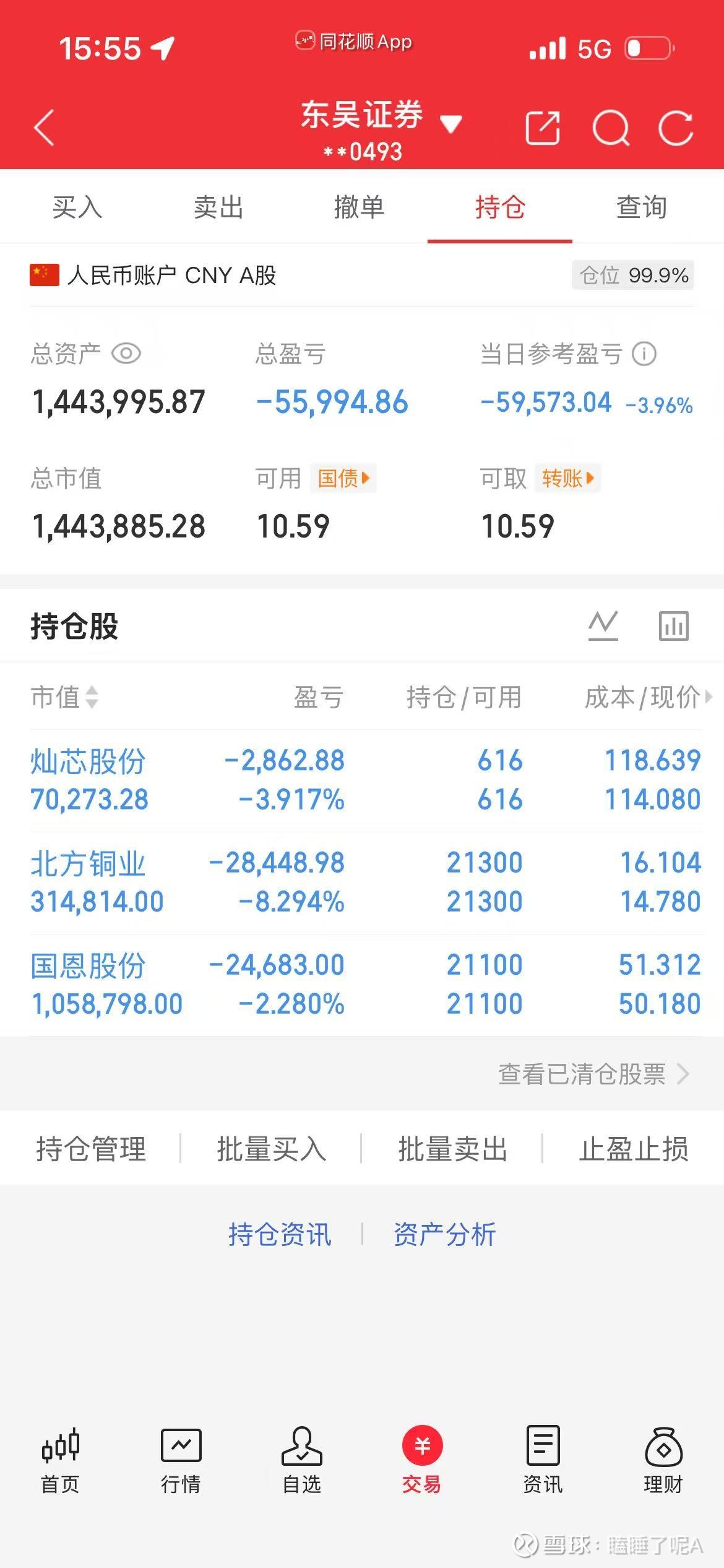 今日无操作,亏5.9w。主要亏损个股为国恩股份#国恩股份# 和北方铜业#北方铜业#,北方铜业是受期货价格下跌所致,主要是受印尼铜矿给了出口配额,同时北方铜业有少量贵金属业务,金价有所下滑。国恩今日的走势是翻倍版本的大盘,昨天按照盘面来预计是走老鸭头,所以对于今日的大幅低开是完全没有预期的,今日份的整体下挫目前也没有找到什么原因,对于业绩好的股,我目前只能看作是错杀,主力中午休市前大幅拉升,吃了波筹码,看到那一块的成交笔数,差点笑出声来,说没庄我是不信的,下图供大家欣赏: