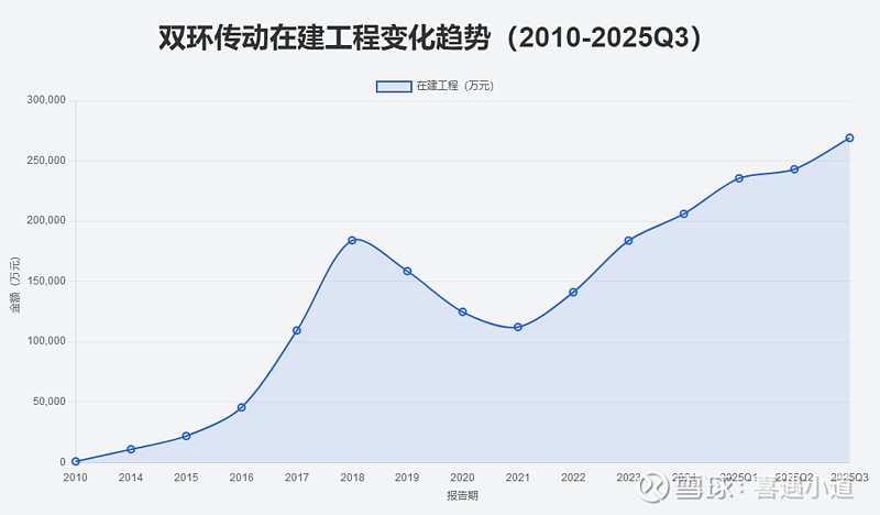 双环传动上市以来在建工程呈现**低基数起步→两轮高速扩张→阶段性消化回落**的阶梯式上行特征,2025年三季度末达26.90亿元,较上市初期增长超375倍,其变化轨迹完全贴合公司战略转型、行业周期与产能布局节奏。