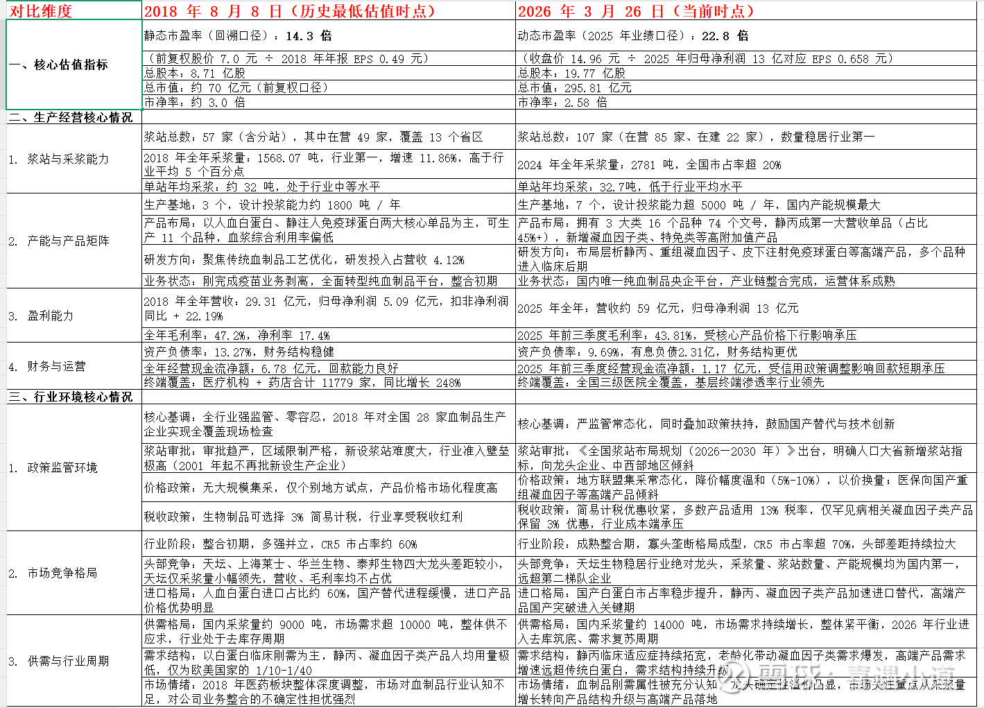 2、公司经营从 “整合转型” 变为 “成熟扩张”:2018 年公司刚完成疫苗业务剥离,处于业务转型、资产整合的初期,市场对其发展存在强烈不确定性;当前公司已完成全国产能、浆站布局,产品矩阵完善,高端研发进入收获期,增长逻辑清晰、确定性极强。 政策环境从 “严监管收紧” 变为 “严监管 + 强扶持”:2018 年政策以全行业严监管、规范行业秩序为主;当前政策在监管常态化的基础上,出台浆站布局规划、创新专项基金、医保倾斜等扶持政策,鼓励国产替代与龙头企业发展。