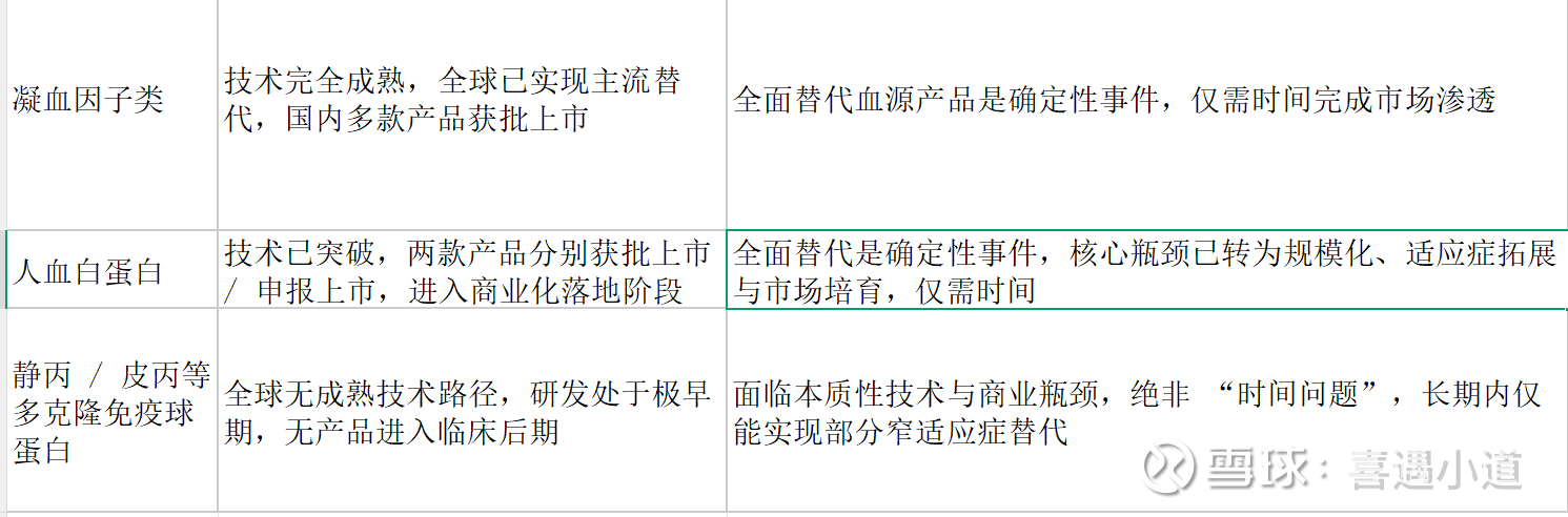 1、凝血因子类和人血白蛋白:技术上已经完成攻克、已有产品获批上市,全面替代血源产品仅需时间完成市场渗透、成本下降和全适应症覆盖,确定性极高;