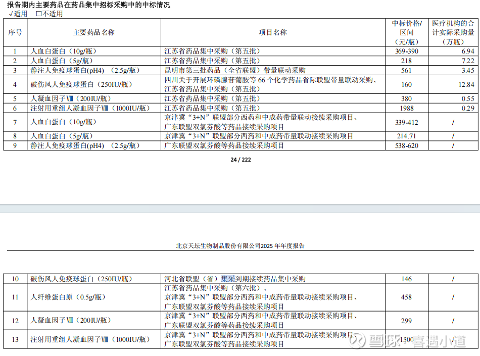 1、上述第 7 项至第 13 项为公司下属血液制品生产企业 2025 年在江苏、天津、河北、广东等地省级或省际联盟集采的中标情况,相关药品供应于2026年 1 月开始陆续执行。