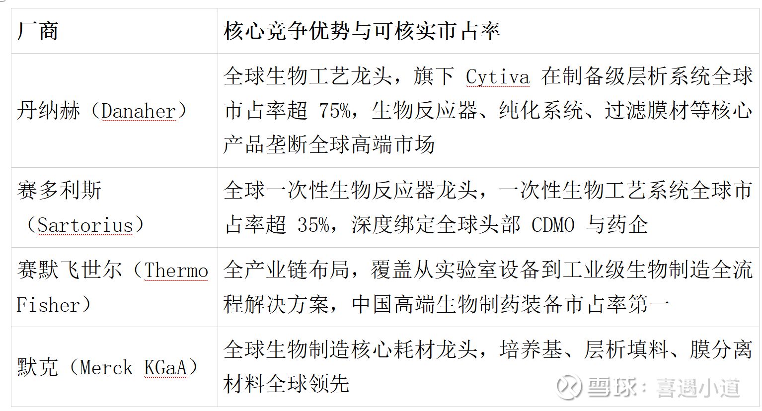 核心厂商为丹纳赫(含 Cytiva)、赛默飞世尔、默克(Merck KGaA)、赛多利斯,四家企业 2024 年在中国生物制药高端装备市场合计市占率约 52%,其中赛默飞以约 18% 的市占率位居首位;全球规模化生产与纯化装备市场前五大厂商(含 GEA、阿法拉伐)合计占有约 42% 的市场份额。