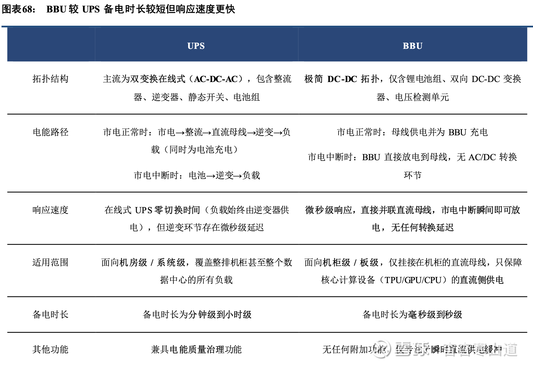 BBU主要用于备电,类似于UPS中的蓄电池,不同之处是随着机柜功率的逐步变大,UPS的长时间(15min到30min)备电变得不再经济,AI数据中心更倾向于用布置在机柜周边(或机柜内部)的BBU取代UPS的部分功能。为了响应尽可能快,BBU直接挂载在机柜的直流母线上,采用锂电池以提高放电倍率,同时 为了 节省成本和空间,往往只具备十几秒到几十秒的备电时间