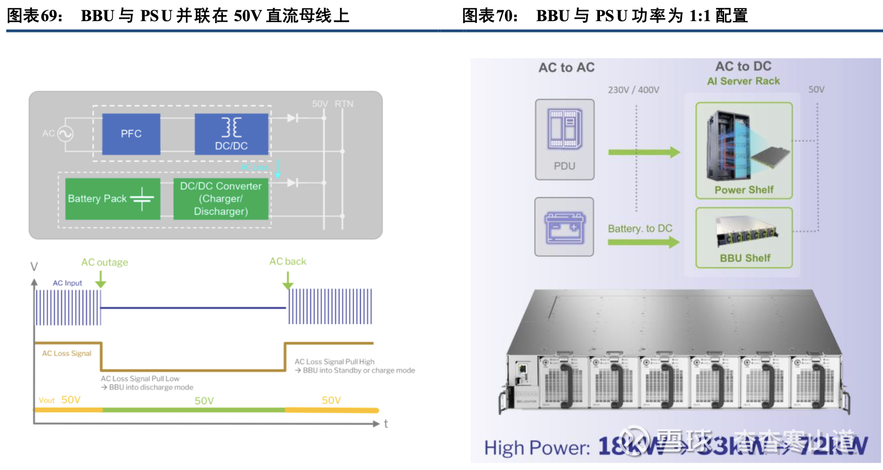 BBU的功率通常与机柜内电源(PSU)的输出功率1:1配置,并与PSU并联在直流母线(目前通常为50V)上。为了便于布置,BBU形态上也采用类似Power Shelf的BBU Shelf形态,并且功率上与Power Shelf对应。在PSU正常供电时,BBU处于待机状态,断电后BBU接受到断电信号启动,输出直流电使得母线电 压维 持在50V,直到再次来电后BBU进入待机或充电状态