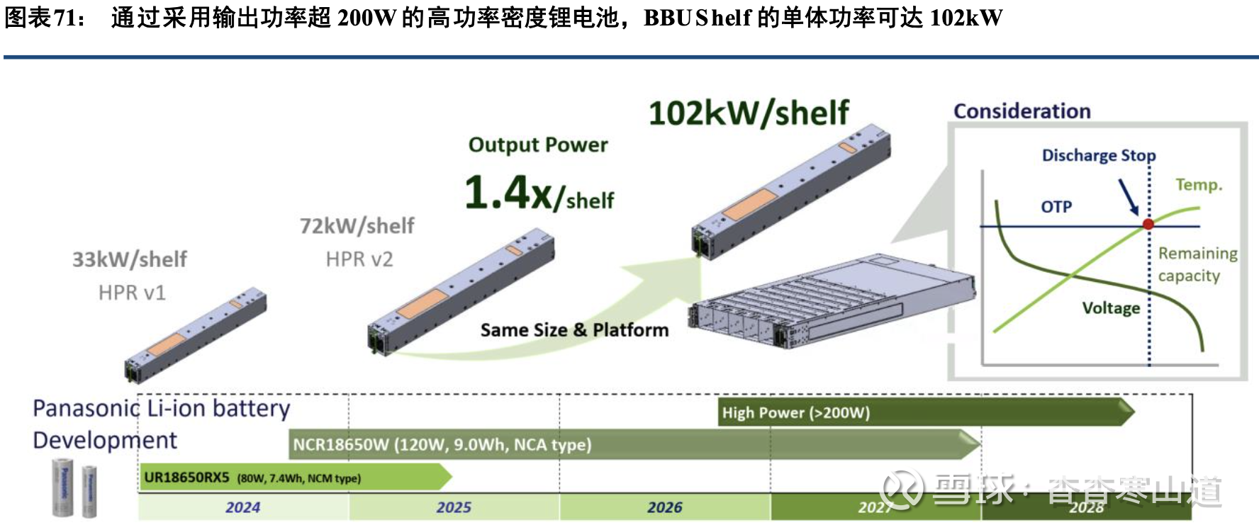 BBU内部采用锂电池供电,为保证高功率输出,通常采用三元圆柱电池,目前多采用18650规格的圆 柱电池,随着机柜功率的提升,也逐步开始采用21700等更大容量的电池。目前,松下在BBU Shelf和BBU所 用的三元圆柱电池方面居于领先地位,根据松下在OCP大会上的资料,目前松下的BBU Shelf输出功率72kW,符合HPR v2标准,未来通过采用更高能量密度的三元圆柱电池(预计为21700规格),单颗电池输出 功率 达到200W,成组为BBU Shelf后,单个Shelf可以输出102kW