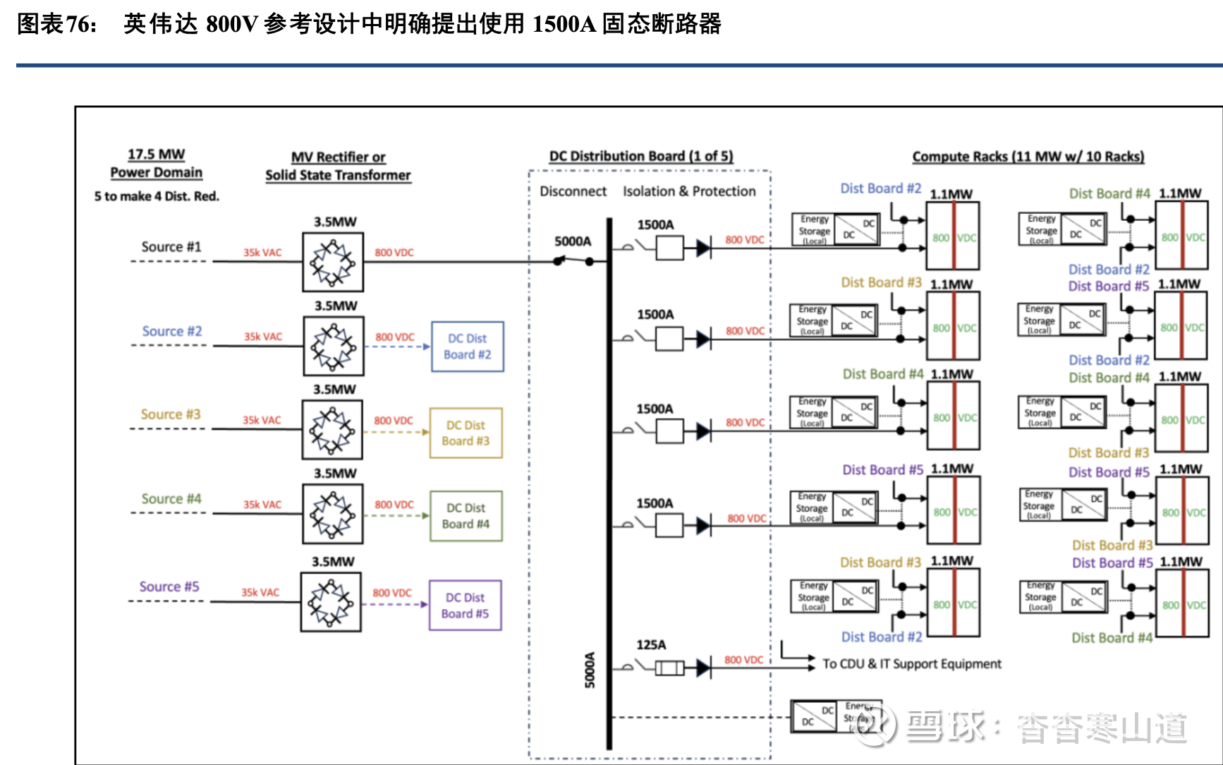 英伟达在800V供电白皮书中给出了设计参考案例,其中为了保证安全输送800V电源,明确提出在直流配电环节使用1500A固态断路器、阻塞二极管,以及故障保护装置,每个1.1MW机柜使用一只1500A固态断路器进行保护