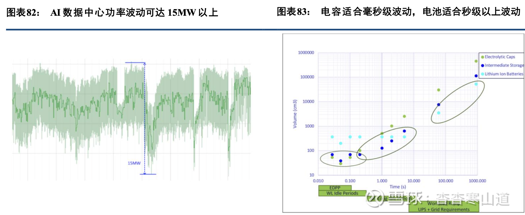 英伟达提出,在AI数据中心运行时,典型GPU负荷波动周期可短至100ms,持续1-5s,然后几分钟 后进入下一循环。针对数据中心负荷波动的不同周期,英伟达提出了两级储能概念:①电容储能置于机柜 内部 ,以解决100ms以下的波动为主;②电站级储能置于数据中心并网点,可以解决10s及以上周期的波动