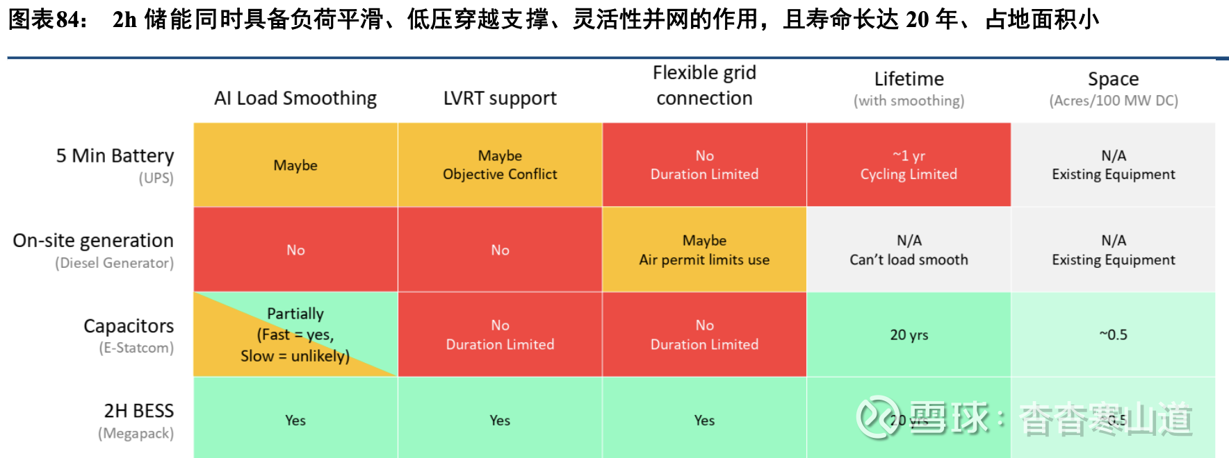 与UPS、柴发、电容器等手段相比较,特斯拉认为2h电池储能系统在AI负荷平滑、低电压穿越支撑 、灵活并网方面都具备优势,而其他手段只具备1-2种功能,且电池储能系统还具备寿命长、占地小的优势。同 时,Fluence在其25财年Q4季报说明会上也认为,电池储能系统有助于提升数据中心的并网灵活性、能够 作为 数据中心的备用电源,还可以提升电能质量、平滑负荷波动。其中,Fluence指出并网灵活性是数据中心配 置储 能最重要的驱动力,配储后数据中心才能满足电网的可用性要求,能够保证数据中心不会对电网造成负面 影响 ,从而加快并网程序的推进