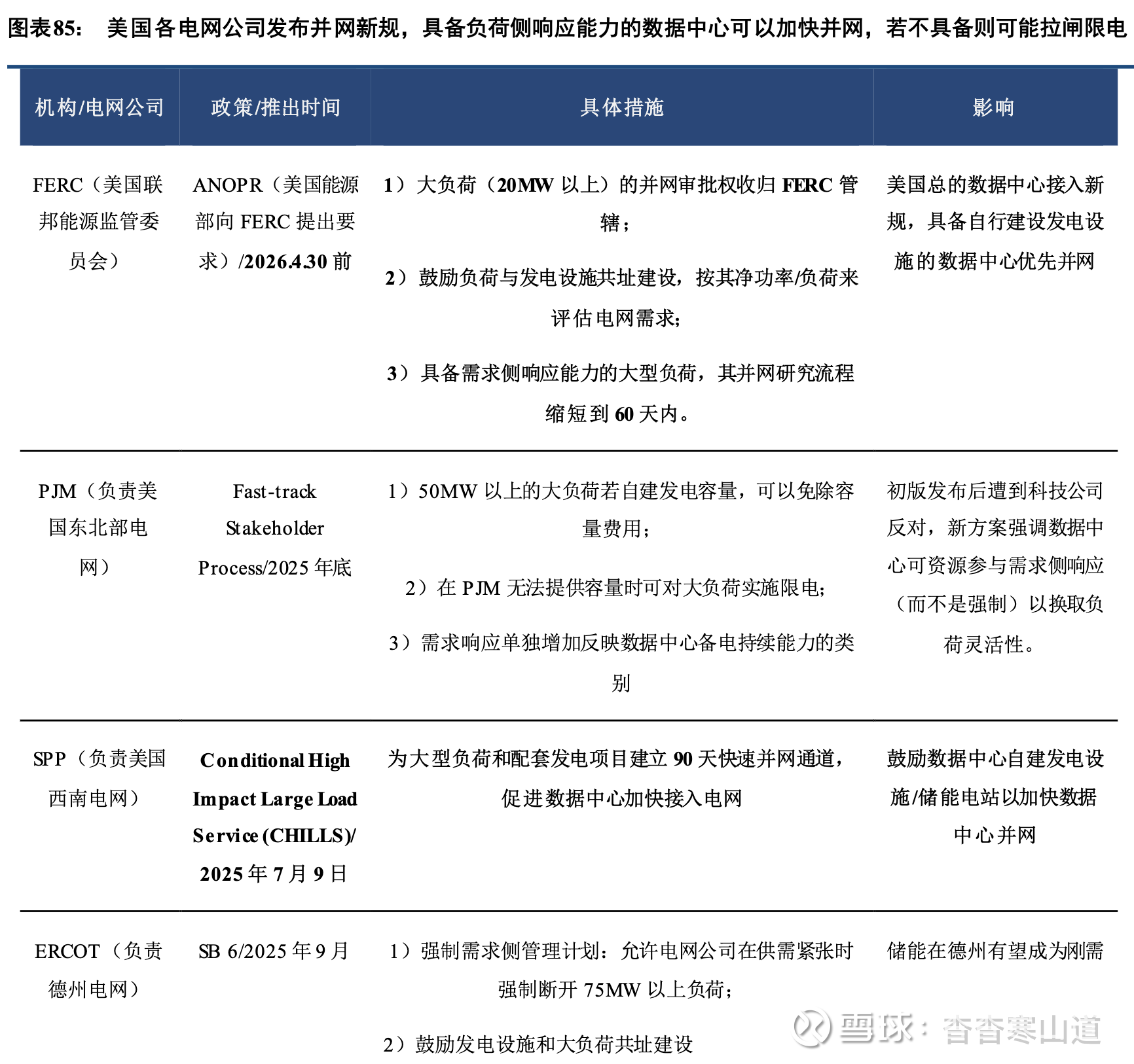 针对美国数据中心爆发式增长,大型负荷接入电力系统将对安全可靠性造成影响,美国能源部(DOE)致函美国联邦能源监管委员会(FERC),要求启动新并网规则的制定,以“加快大型负荷的并网”。此 前主 要矛盾在于,新建发电设施的并网流程由FERC管辖,而大型负荷的并网则由各州自行负责,因此存在明显 的脱 节。美国能源部的信件认为大型负荷的管理方式应与发电厂一致,且均应由FERC进行管辖,确保大型工 业负 荷和数据中心能够及时、无歧视地接入电力系统。特别提到,若负荷具备灵活性且可削减(即需求侧响应 能力 )其并网研究(并网前的必备流程)应在60天内完成。因此若数据中心配置储能,作为大型负荷就具备 了需 求侧响应能力,能够加快并网流程的实施。目前FERC正就此事进行政策制定,预计将于2026年4月30日发布。