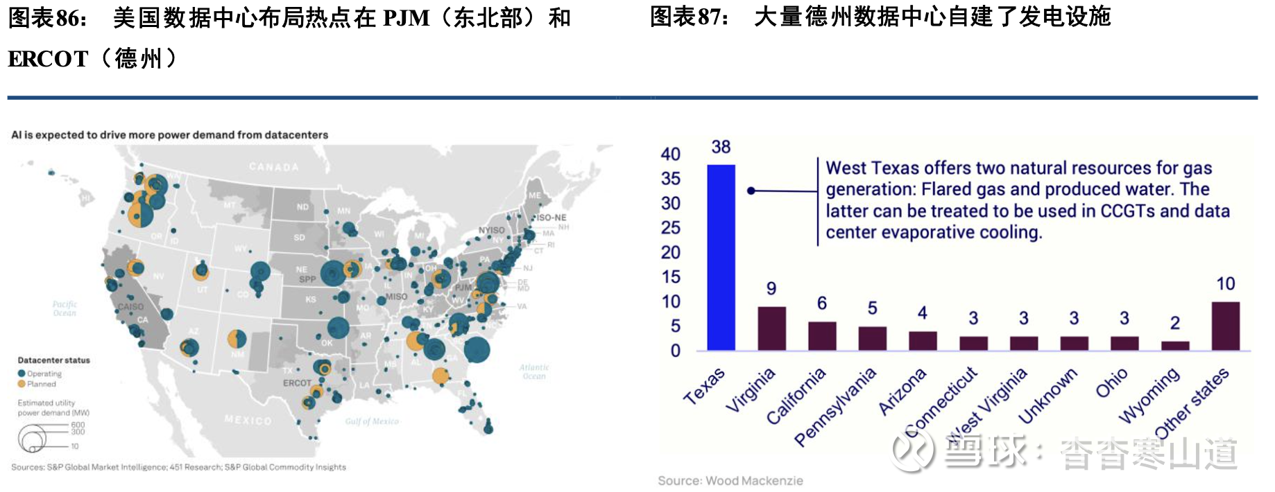 根据Wood Mackenzie的US data center pipeline Q3统计,截至10月中旬,美国数据中心项目规划装机 容量达到245GW。这些项目以及超大规模数据中心签署了可再生能源协议,大多集中在得克萨斯州。2025年以来 ,全美超过四分之一的项目规划装机容量都集中于德州,当地的储备项目容量从第一季度的35GW,累 计至第三季度已实现达到67GW,几乎翻番。同时,根据PJM(美东/中大西洋)发布的2025年长期负荷预测,到2030年夏季峰值负荷将增加约32 GW,其中几乎全部增量都来自数据中心。ERCOT(德州)则显示大型负 荷并 网队列在一年内翻了4倍,达到约226GW,其中73%-77%为数据中心,尽管其中可能有大量“投机性”申请,存在泡沫可能