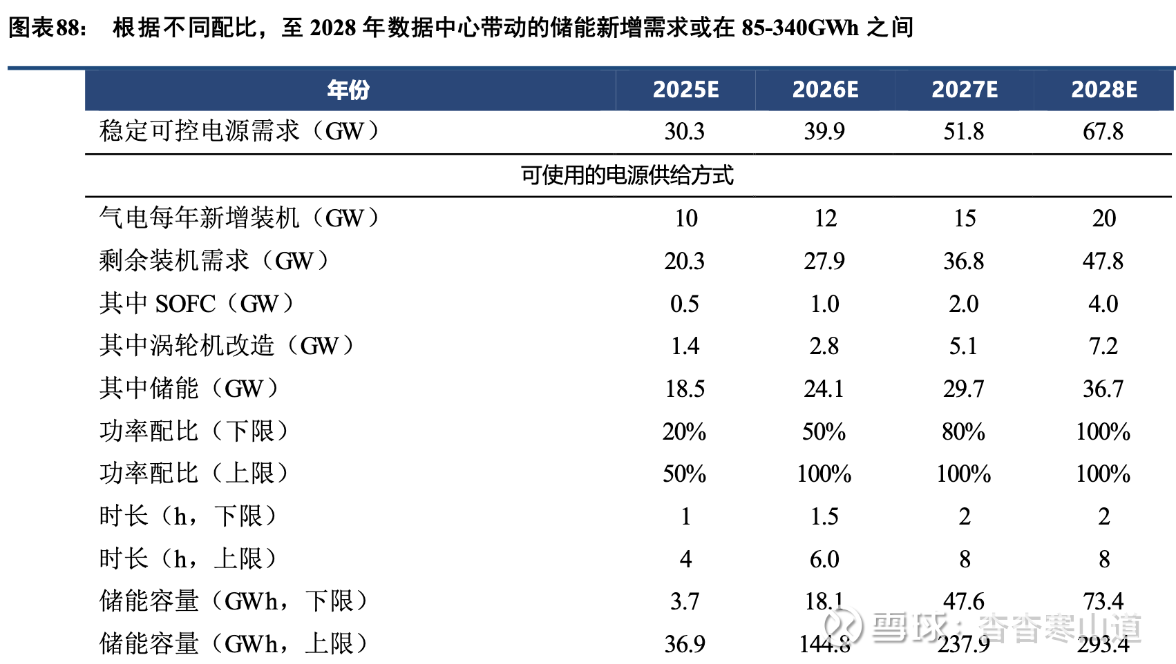 我们此前已在报告《数据中心拉大美国电力装机需求,光储、SOFC是目前可行的解决方案》和《再论AIDC配储是解决北美电容量缺口的必然选择》中详细论述了北美缺电现状。即使考虑SOFC、退役航发改燃 机后 ,对储能的需求仍高达85-340GWh之间(2028年新增量),取值浮动范围较大,主要因未来配储功率、时 长比 例不确定。若未来美国采取高比例绿电直供方式为数据中心供电,时长有望取到6-8h;即使只是起到加快 并网、改善电能质量的作用,时长也需达到2-4h