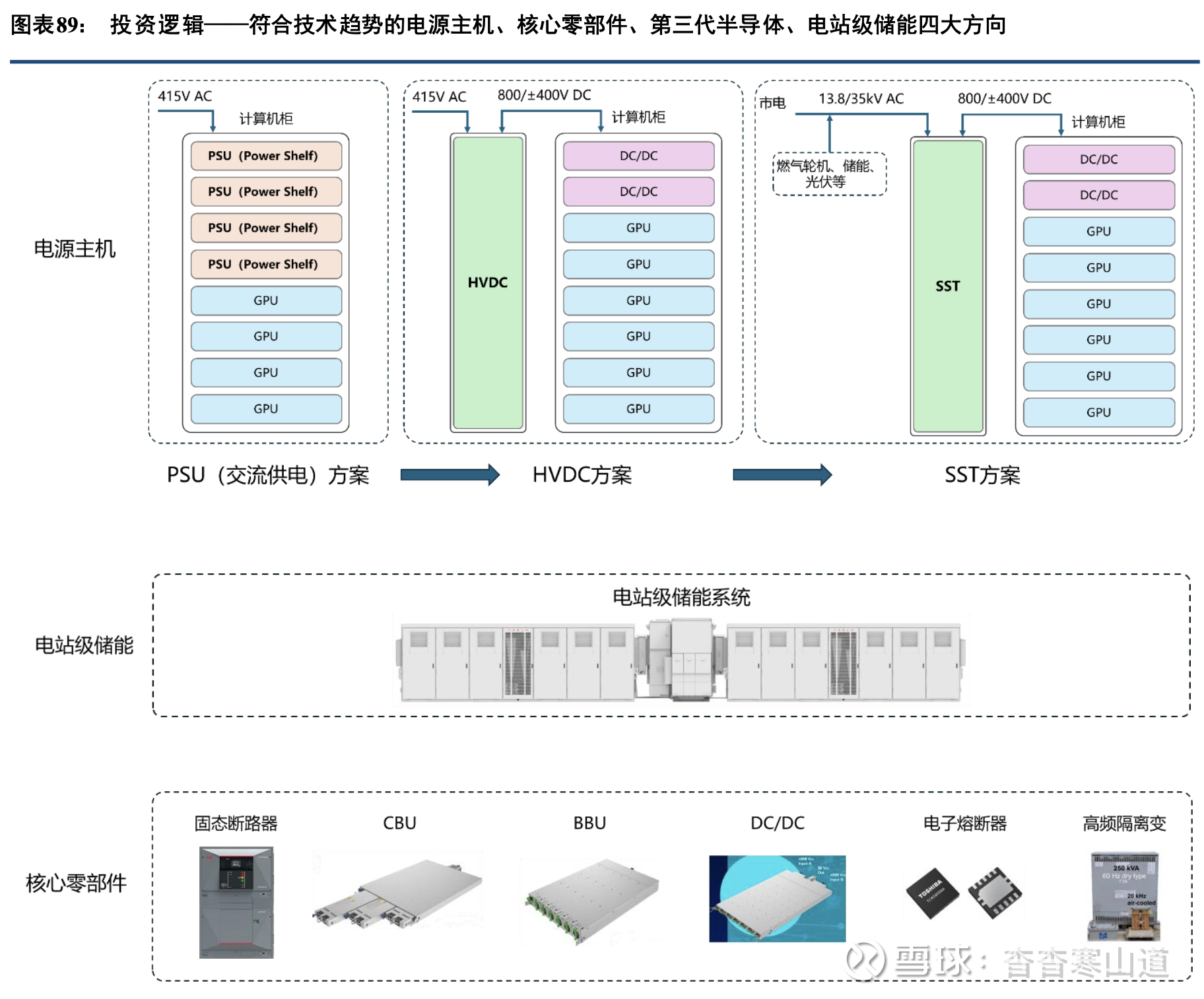 (3)为实现直流化、大功率化而不可缺少的核心零部件,如固态断路器、CBU/BBU、DC/DC、高频隔离变等这些环节主要是AI数据中心为解决大功率、直流供电问题所新增的,属于从无到有,弹性较大。其中 ,我们尤其看好固态断路器,主要是因为固态断路器在直流供电系统中属于必备,且是英伟达白皮书中明 确提 到的方向。CBU/BBU中我们相对看好CBU,因其可平滑芯片功率波动且能在一定程度上替代BBU。此外DC/DC电源、eFuse电子熔断器也属于新增环节,但价值量和重要性相对较低。高频隔离变则需等待SST放量。