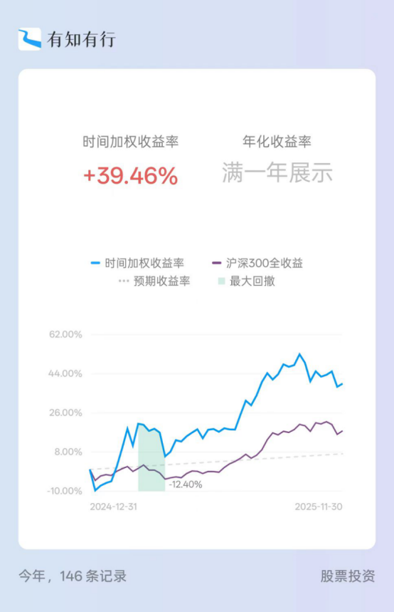 截至2025年11月28日,2025年以来我的时间加权投资收益率为39.46%(基金经理视角),同期沪深300指数(399300.SZ)上涨15.04%。