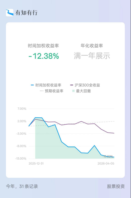 继2026年2月份我的投资组合下跌10.69%以来,3月份继续下跌。截至2026年3月31日,2026年以来我的时间加权投资收益率为-12.38%(基金经理视角),同期沪深300指数(399300.SZ)下跌3.89%。