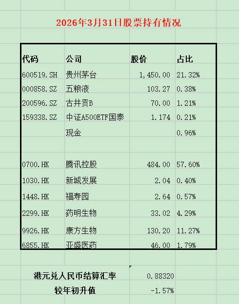 2026年3月份,我持有的股票中,腾讯和药明生物跌幅较大。腾讯从2月27日的518港元/股跌至3月31日的484港元/股,下跌6.56%。药明生物从2月27日的40.22港元/股跌至3月31日的33.02港元/股,下跌17.9%。