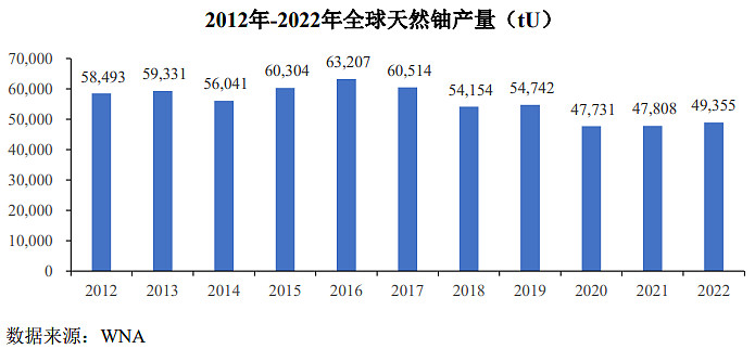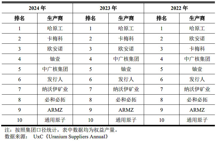 全球天然铀行业集中度较高。根据 WNA 统计数据,2022 年全球产量排名前 10 位的公司占据了全球 90%以上的天然铀产量。
