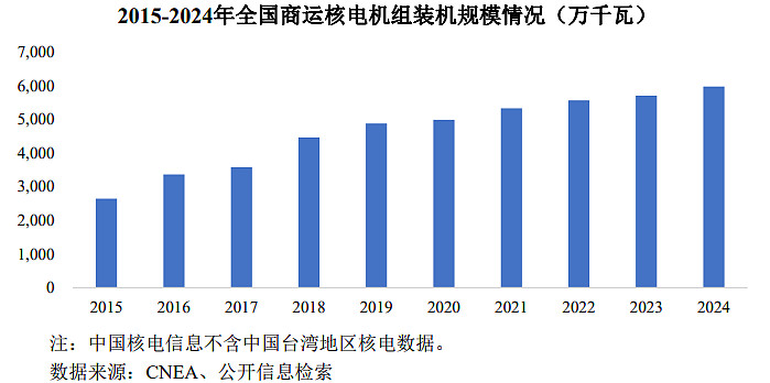 近十年间我国核电产业迅速发展,商运核电机组规模持续增长。根据 CNEA统计数据,2024 年我国新增商运核电机组 2 台,截至 2024 年 12 月 31 日,我国商运核电机组数达到 57 台,总装机容量 5,976 万千瓦,位列全球第三,2015 年至 2024 年装机容量复合年均增长率达到 9.49%;核电装机容量占全国电力装机总量的 2.1%。
