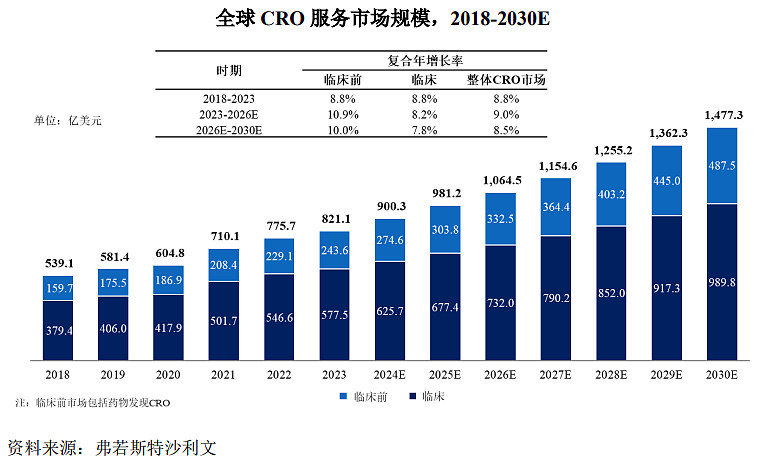 2023 年,全球临床前 CRO 市场规模为 243.6 亿美元,预计在 2026 年和 2030 年将分别达到 332.5 亿美元和 487.5 亿美元,2023-2026 年及 2026-2030 年的复合年增长率分别为 10.9%及 10.0%。