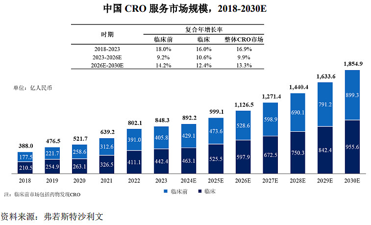 2023 年,中国临床前 CRO 服务市场规模为 405.8 亿元人民币,预计于 2026 年及 2030 年将分别达到528.6 亿元人民币以及 899.3 亿元人民币,2023-2026 年以及 2026-2030 年的复合年增长率分别为 9.2%和 14.2%。