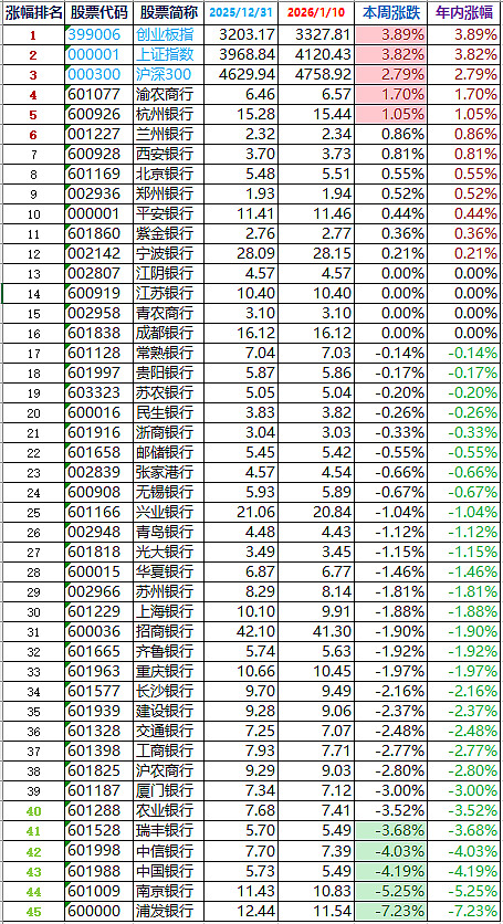 年涨幅超10%的银行股0家:银行股2026年开年。