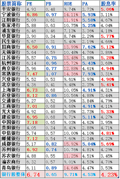 采用PE、PB、ROE、PA、股息率5个维度估值。当前市场看好那些被填充、加粗、变色的维度>=3项的银行股。