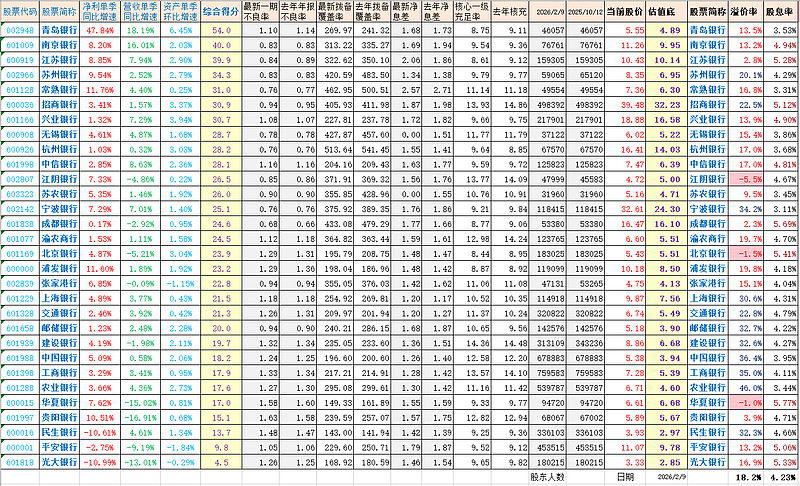 下表是大佬刘长期关注的30家银行股,考虑摊薄效应、业绩变化后的动态估值。(数据更新有延迟)