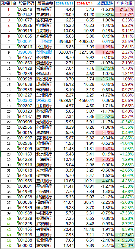 年涨幅超10%的银行股2家:青岛和宁波。