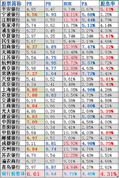 采用PE、PB、ROE、PA、股息率5个维度估值。当前市场看好那些被填充、加粗、变色的维度>=3项的银行股。