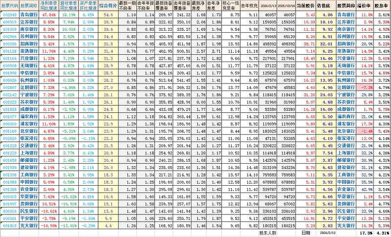 特别是优秀环太湖城商行,文末表格中的溢价率普遍低于20%。股份行的综合得分也上来了,招商银行、兴业银行竟然久违地又进了前10。