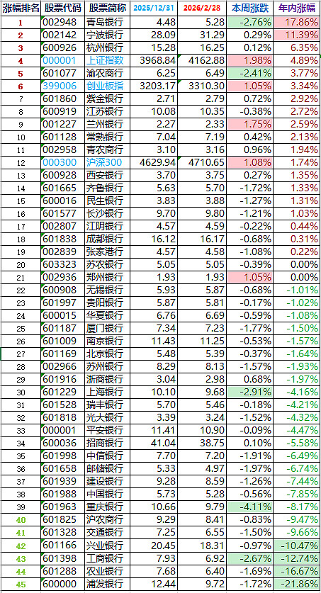 42家银行股涨幅排行榜(前复权):