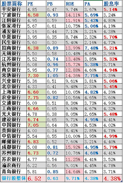 采用PE、PB、ROE、PA、股息率5个维度估值。当前市场看好那些被填充、加粗、变色的维度>=3项的银行股。